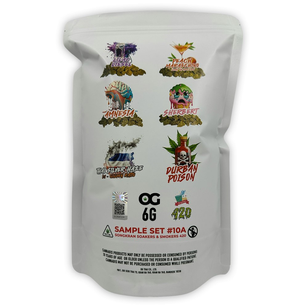 Celebrate the Songkran festival with SAMPLE SET #10A: SONGKRAN SOAKERS & SMOKERS 420, and explore the world of cannabis with these six exceptional strains. Don't forget to check out its sister set, SAMPLE SET #10B: SONGKRAN SOAKERS & SMOKERS 420, for even more cannabis exploration options. Order yours today and let the celebration begin!
