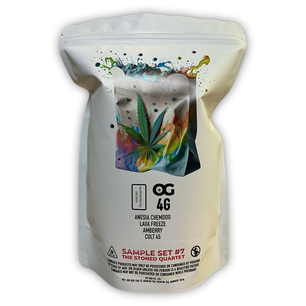 "The Stoned Quartet" is the code name for Sample Set #7 (Anesia Chemdog, Lava Freeze, Amberry, Colt45) a cannabis sampler set that features locally indoor grown strains, ensuring the highest quality and freshness. Each of the four strains included in the set is grown with care and precision, resulting in a diverse range of effects and flavors. The THC levels of these strains range from 20% to 26%, providing a potent and enjoyable experience for all types of cannabis consumers. Whether you're a seasoned pro or a newcomer to the world of cannabis, this sampler set is sure to impress with its locally grown and high-THC strains.