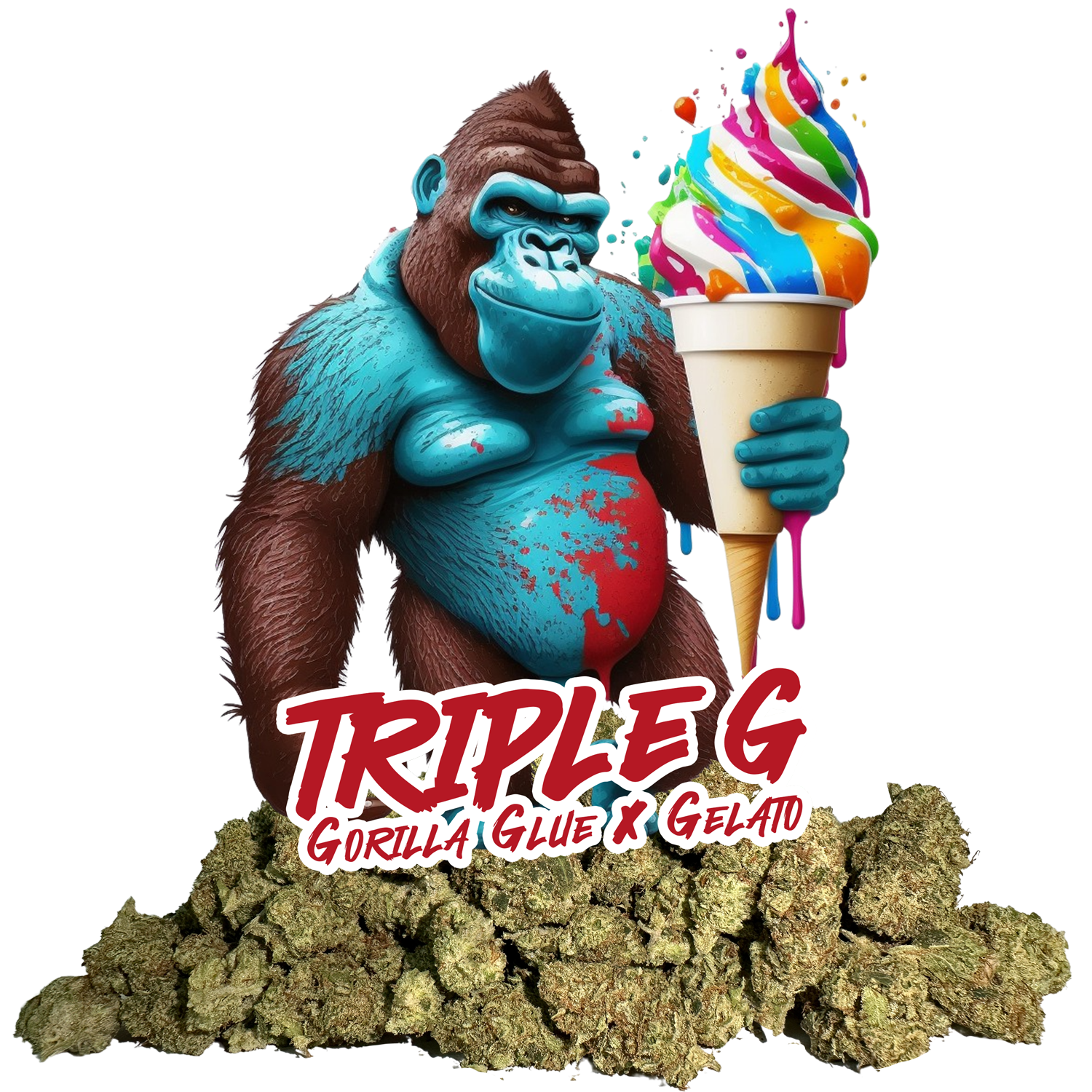 Triple G is an Indica Dominant hybrid strain with an 85% Indica and 15% Sativa composition. This top-shelf strain boasts a THC content of 25% and a CBD content of 0%. Triple G hails from a prestigious lineage, paying tribute to its powerful and famous ancestors: Gorilla Glue and Gelato. Both of these varieties have taken the cannabis world by storm, known internationally for their superior strength, mind-blowing flavor, and high productivity.